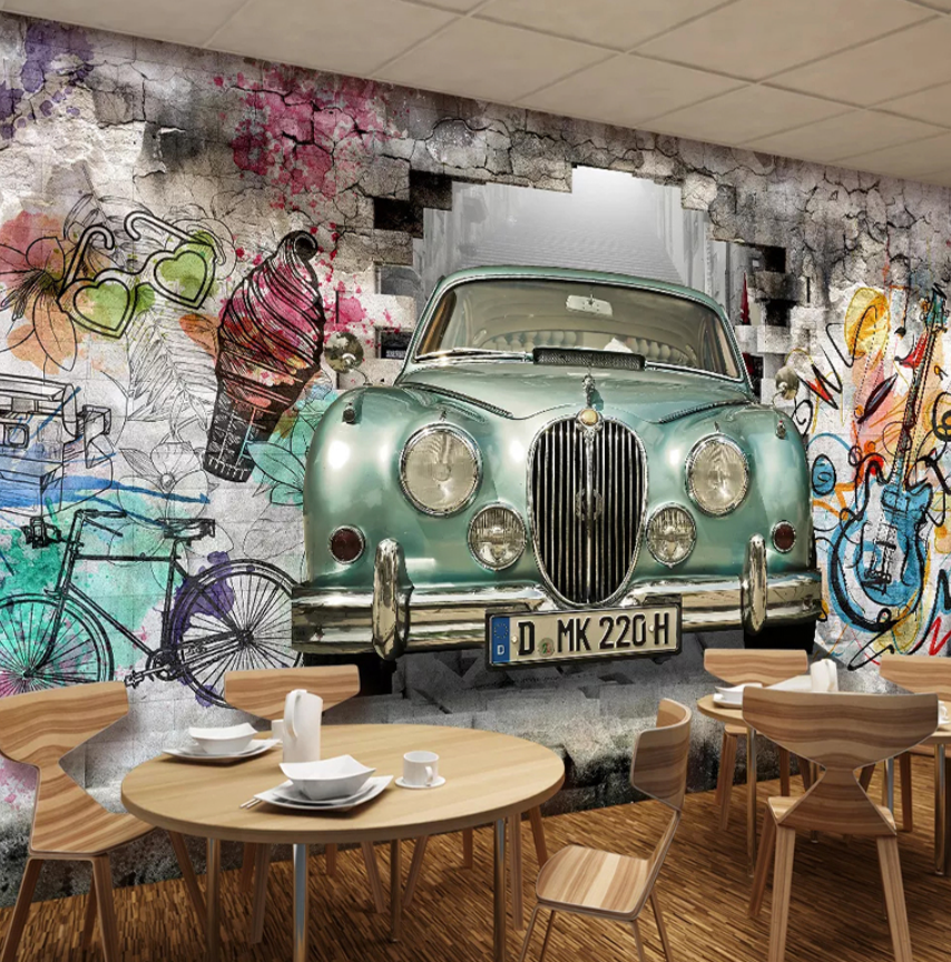 Retro Old Car Restaurant Cafe Living Room Background Wall Sticker Removable 3D