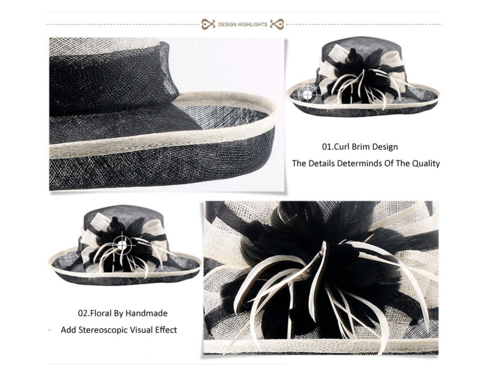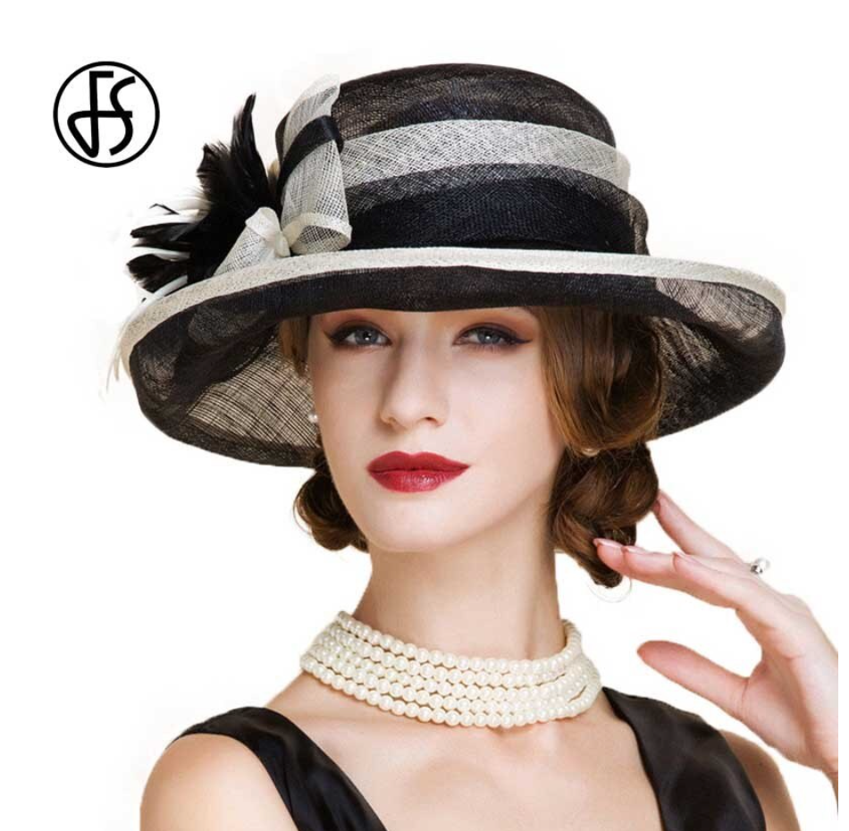 FS Black White Ladies Church Hats Women Elegant Kentucky Fascinators Hat Wedding Linen Fedora Wide Brim Floral Derby Hat