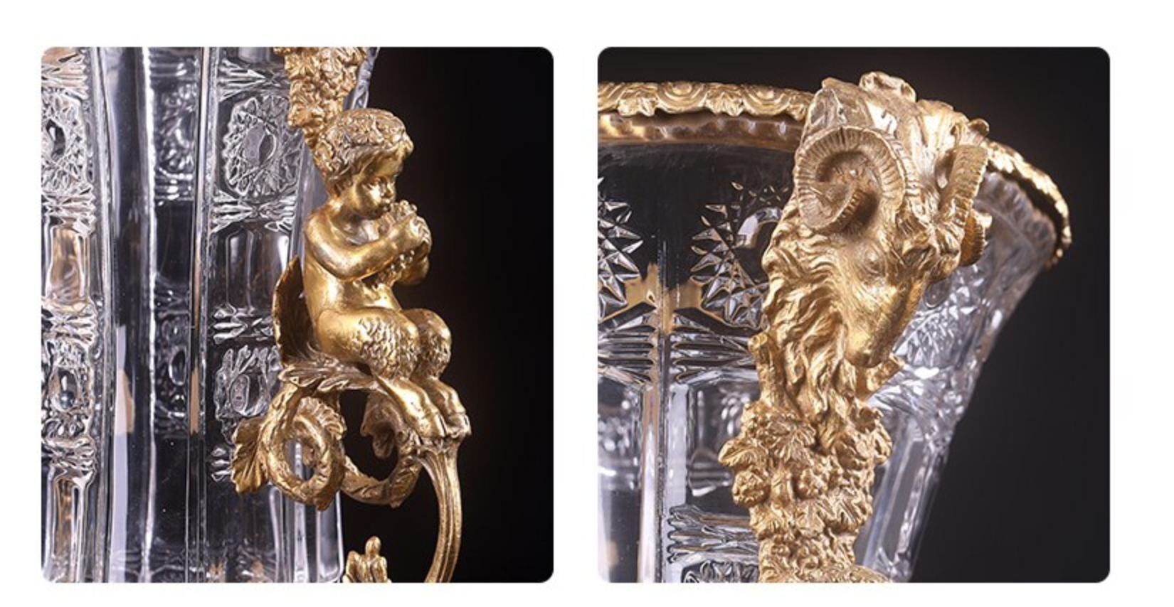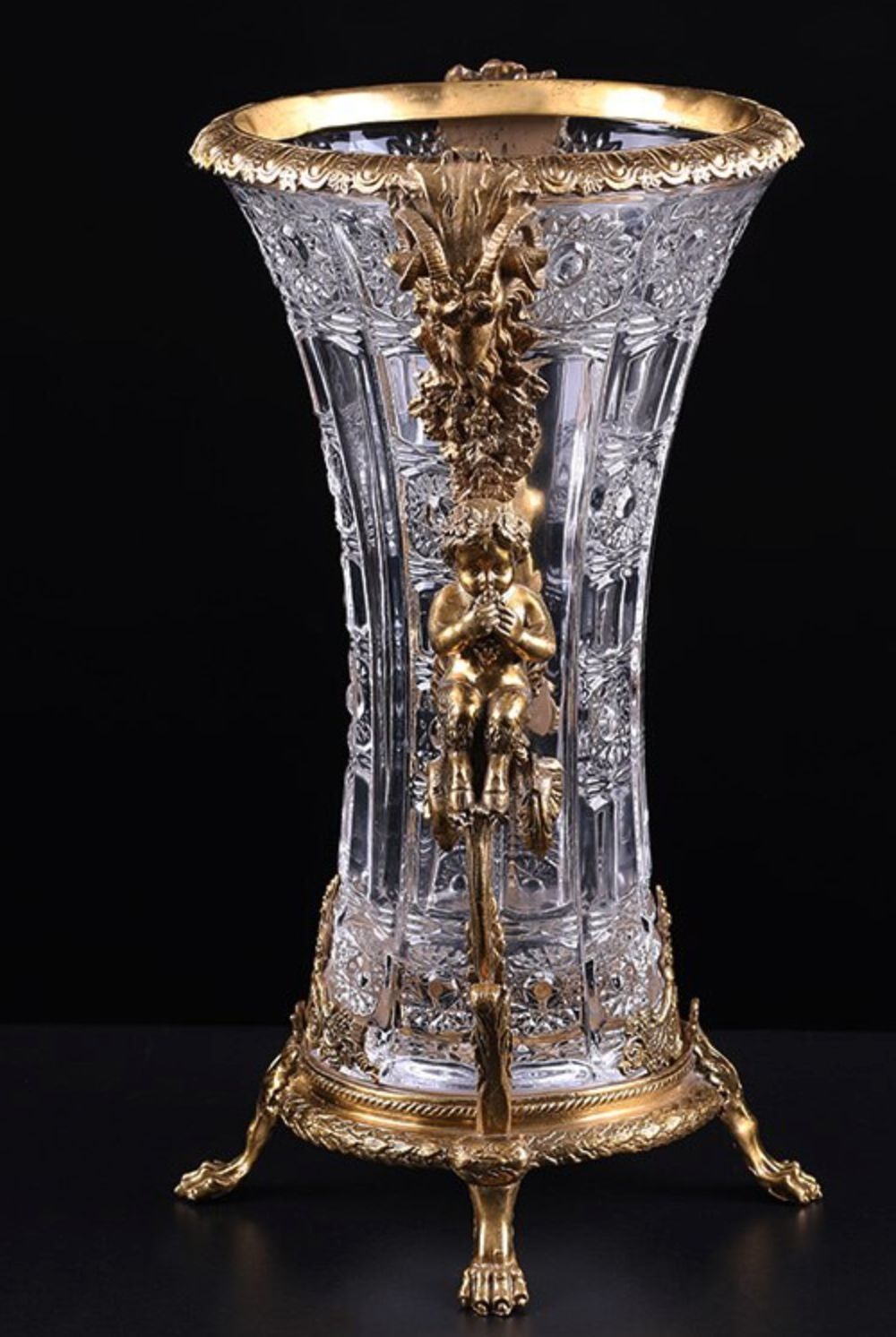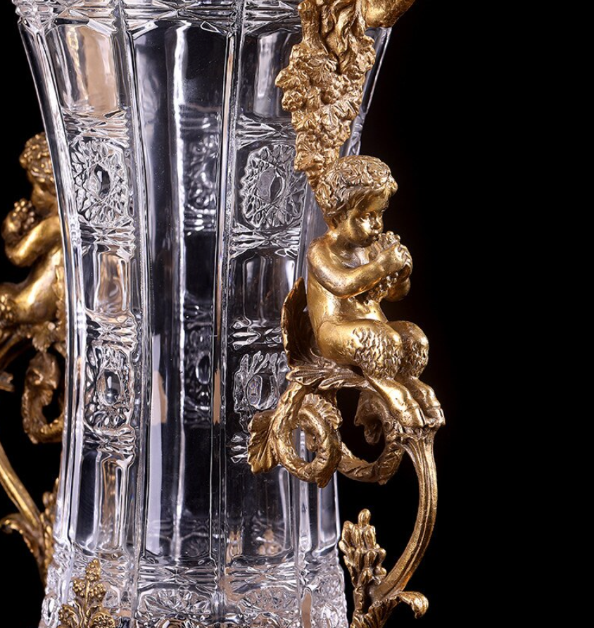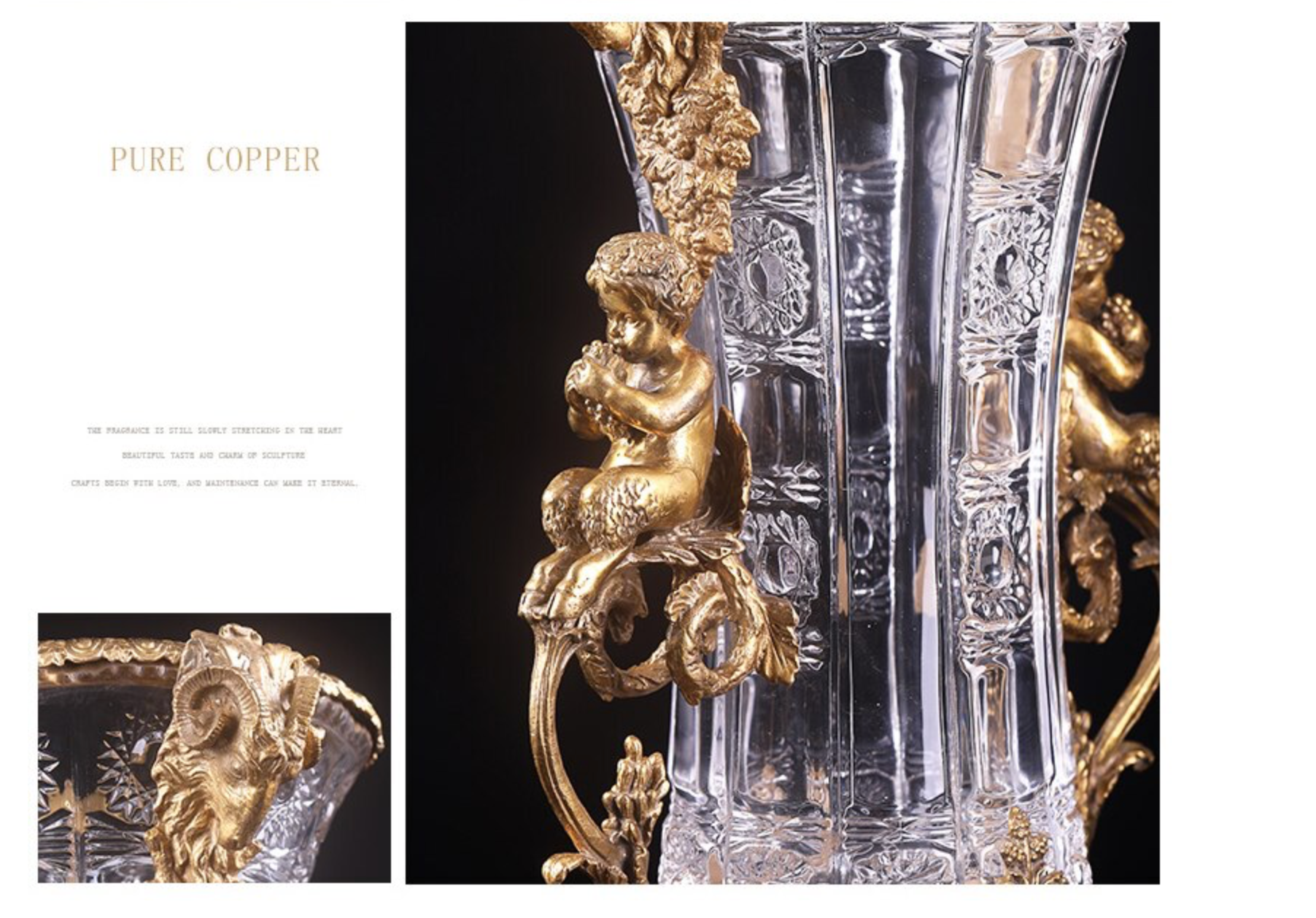 Luxury Crystal Glass Vase with Golden Two Angel Boys Figurines Brass