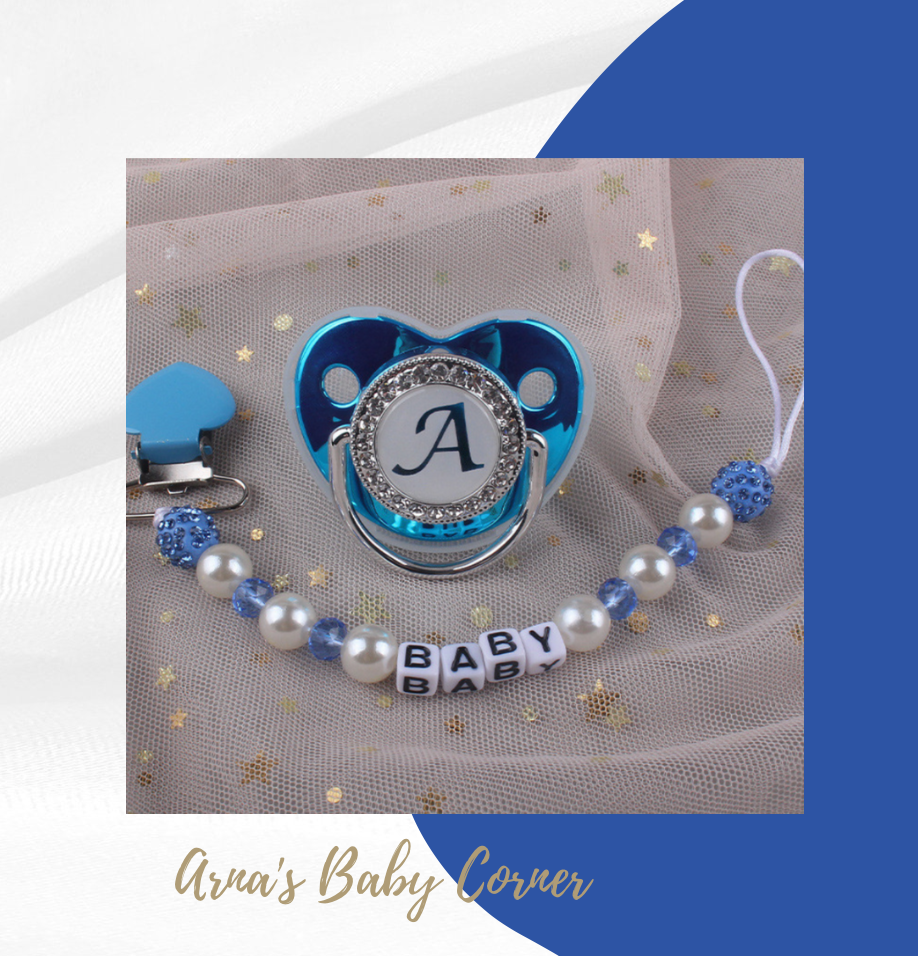 Blue Metallic Baby Pacifier & Clip - Alphabet Letter Infant Pacifier Unique
