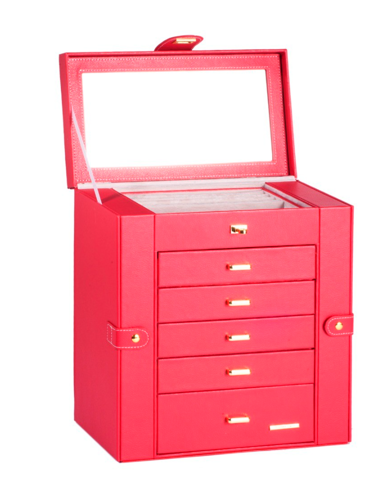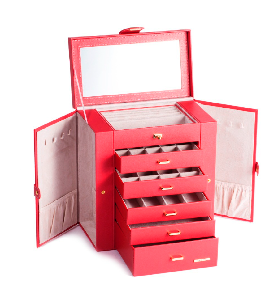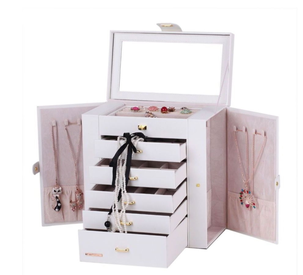 5 removable drawers for maximum jewellery storage. The deeper bottom drawer has only one compartment. Its size is 18cm"L x 14.5cm"W x 6cm"H. The other 4 drawers have the equal size. Their size is 18cm"L x 14.5cm"W x 2.5cm"H. Drawer 1 has 20 equal size compartments; Drawer 2 has 12 equal size compartments; Drawer 3 has 4 equal size compartments; Drawer 4 has just one compartment. 2 swing out cabinets, each with 8 necklace hooks and 2 storage ledges.