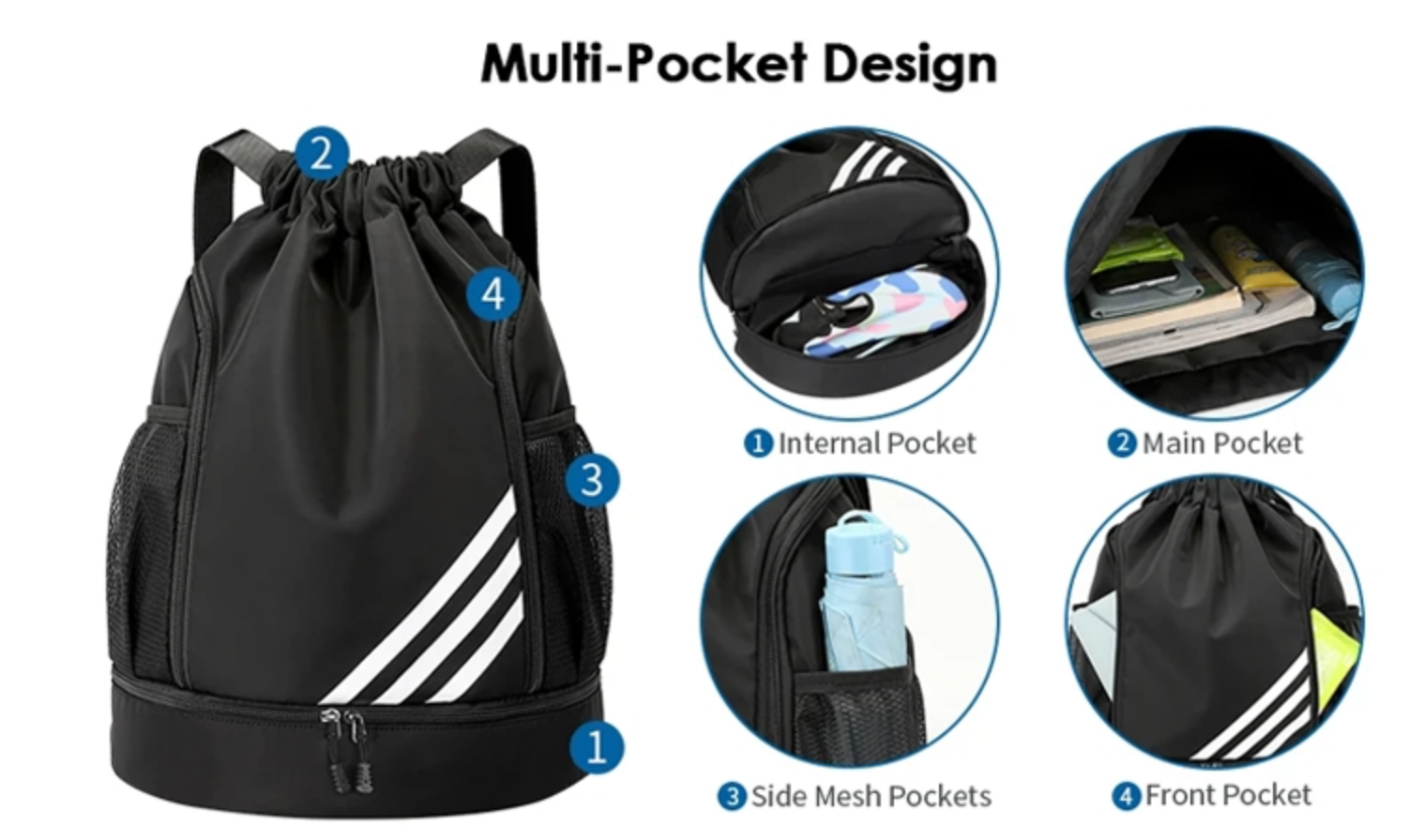 Heaps of room and pockets plus a seperate compartment to put your footwear.