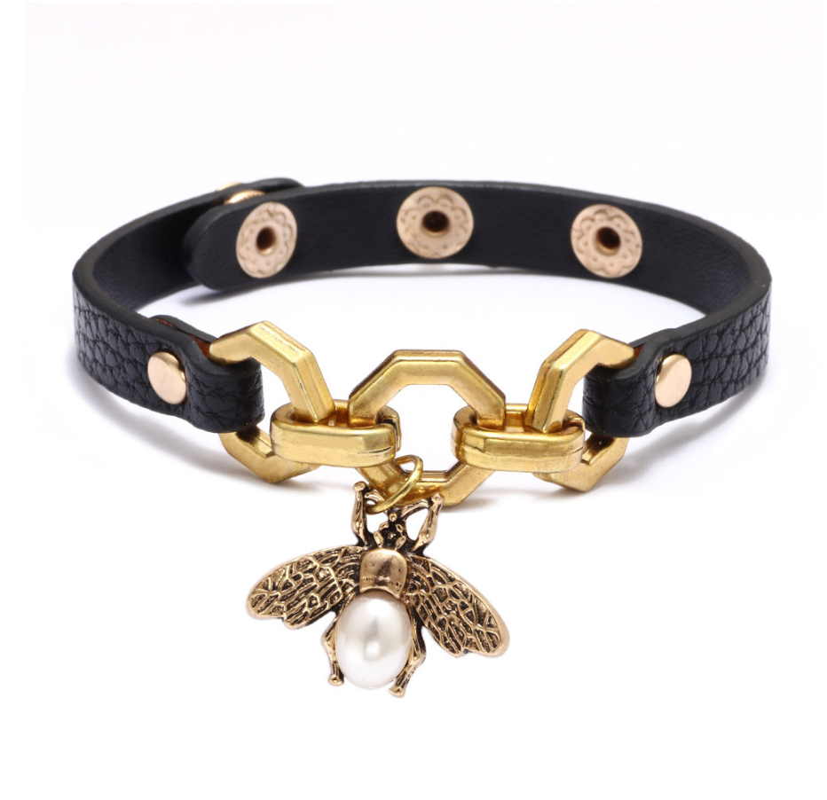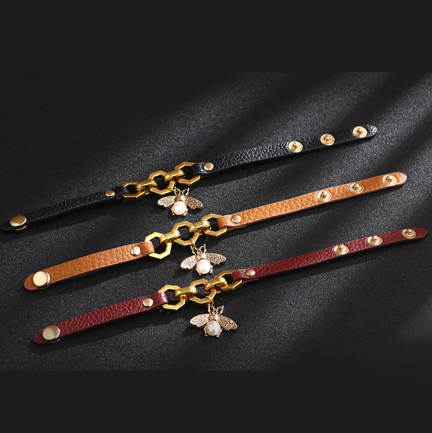 Bee Pendant Charm Bracelet Brown PU Leather Metal Button